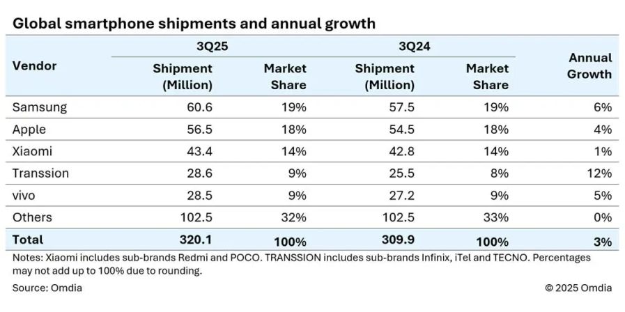 Mənbəyə görə, Samsung hesabat dövründə 19% bazar payı ilə liderliyini qoruyub saxlayıb, tədarüklər isə 2024-cü ilin eyni dövrü ilə müqayisədə 6% artıb. Analitiklər brendin uğurunu Galaxy Z Fold 7 və Flip 7 qatlanan smartfonlarının güclü satışları ilə əlaqələndirirlər, flaqman Galaxy S25 xəttinə tələbat isə orta səviyyədə olub. Apple (18%) ikinci yerdədir.Siyahıda növbəti yerdə bazarın 14%-ni tutan Xiaomi şirkətidir ki, bu da əvvəlki illə eynidir. TECNO və Infinix brendlərinə sahib olan Transsion şirkəti üçüncü rübdə bütün smartfonların 9%-ni satıb, vivo isə oxşar göstərici ilə ilk 5-liyi tamamlayıb, lakin illik müqayisədə daha aşağı artım tempi müşahidə olunub.
