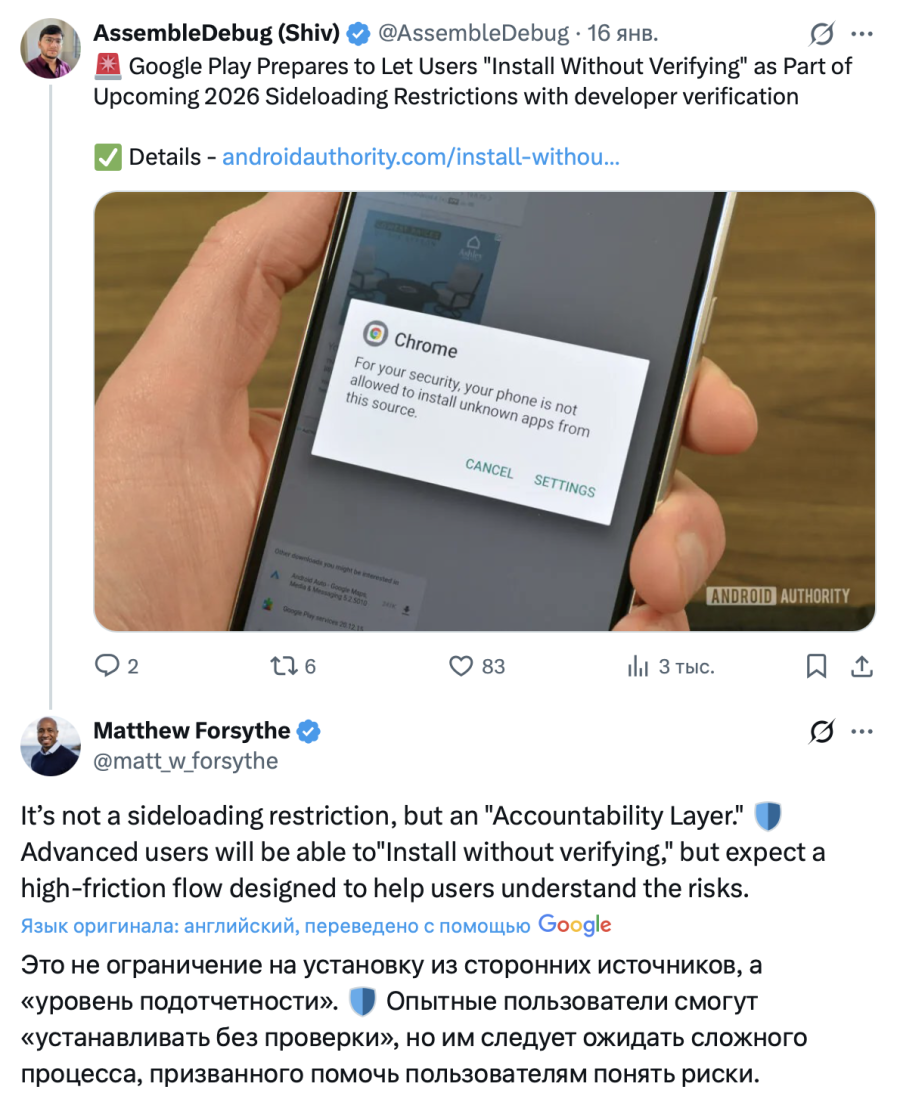 Google Play Developer Experience şirkətinin Məhsul İdarəetmə Direktoru Metyu Forsayt, bunun qadağa deyil, əlavə bir «hesabatlılıq təbəqəsi» olduğunu iddia edir — istifadəçilərə riskləri izah etmək və onları Google Play-dən kənarda APK-lar quraşdırmadan əvvəl məlumatlı qərarlar qəbul etməyə məcbur etmək üçün hazırlanmış bir sistem.