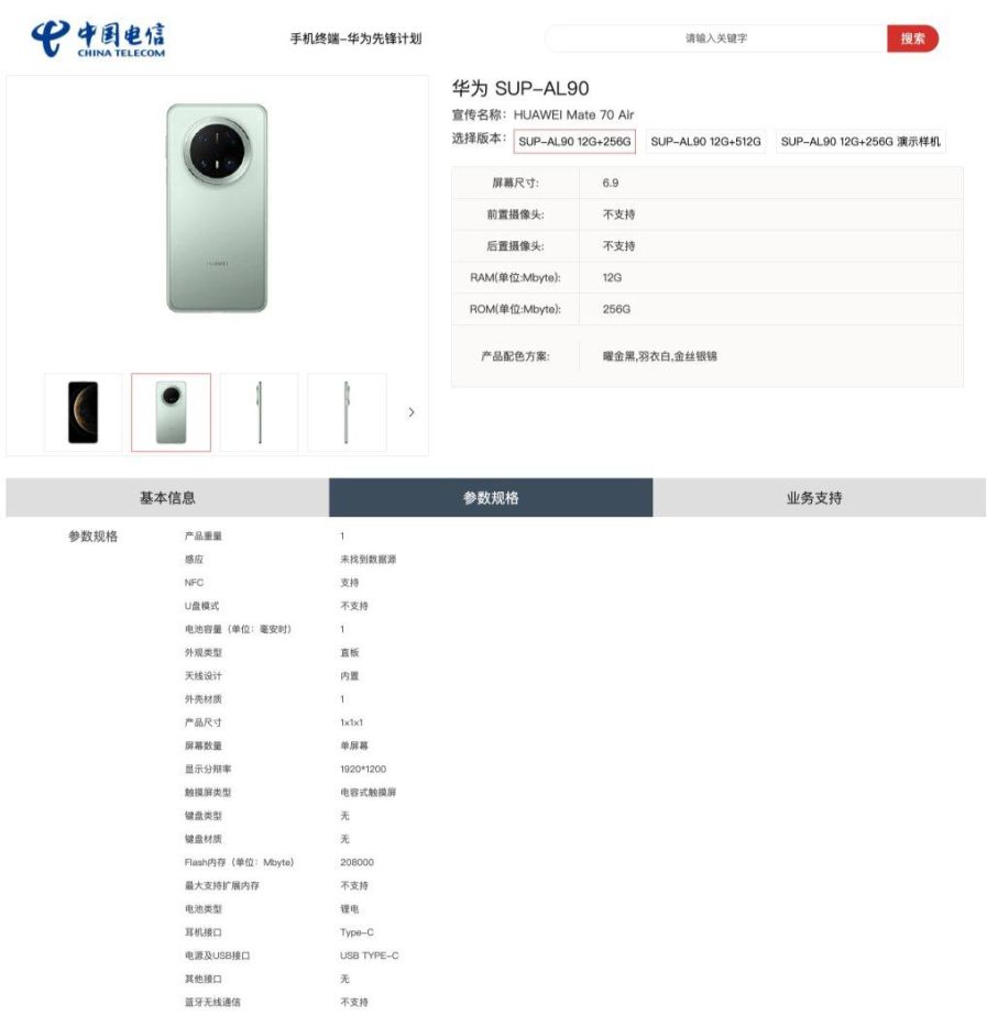 HUAWEI Mate 70 Air, məhsul kartında SUP-AL90 model nömrəsi altında verilmişdir. Yeni cihaz 1920×1200 piksel təsvir ölçülü 6,9 düymlük displey, 12GB/256GB və 12GB/512GB RAM və yaddaş seçimləri, HarmonyOS 5.0 ilə təchiz ediləcək. Görüntülərə əsasən, model ikiqat ön kamera, əyri ekran və üç obyektivli dairəvi kamera modulu ilə təchiz olunacaq.